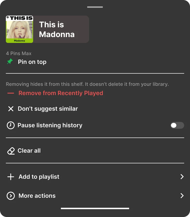 Long-press to pin, pause, or remove. One surface, reversible.